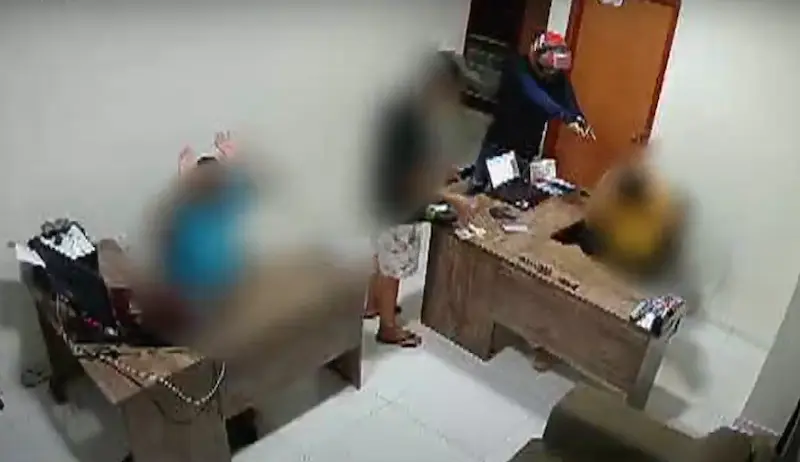 A dupla entrou no local com armas e capacetes para não ser identificada. Imagens de câmeras de segurança mostra o momento em que eles anunciam o assalto e um dos suspeitos agride uma funcionária da empresa, que estava fazendo serviço de limpeza no andar térreo.